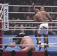 "The Beast" threw some nice low kicks, and when a fatigued Akebono relaxed his guard, got a solid left punch through that stunned the Sumo wrestler. It was a right hook that sent Akebono to the canvas for the first down. But to his credit, Akebono struggled to his feet to beat the count.