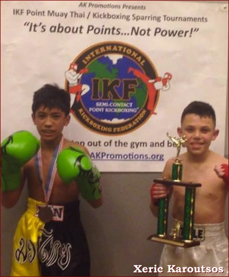 The IKF Point Kickboxing / Muay Thai Tournament that was held in conjunction with the IKF Spring Classic was a small but really exciting event! Spectators crammed into the small room adjacent the Conference room after the main tournament completed around 6:PM on this past Saturday. Only few knew how exciting the competition would be but later they would all learn what several of us already know IKF Point Kickboxing / Muay Thai Sparring Tournaments are not only the incubator for the future of our sport but really one of the most exciting semi contact events on the circuit! The great thing too that we had several fighters that participated in last year's IKF PKB and won the IKF Spring Classic Championship in Full Contact division this year like rising female teen Gia Marie Henkel of Atlanta, Georgia. Most that participated in this event were first timers for the PKB but by all accounts they and their team, thoroughly enjoyed the action and are pledging to continue to be involved. I must say this and this is all due respect to everyone in the tournament. I have been impressed many times by a lot of kid fighters over my 40 plus years in the martial arts. However, Xeric Karoutsos of Orlando, Florida ( At Right with trophy) 12 years old made me take notice. This is why first he fought in the Full Contact Tournament and lost a close decision. He then asked me for the belt to put around his opponents waist! What! Later, he fought again in the PKB and took on a very skilled opponent who in honesty, impressed everyone in the room and they did not want to fight him Xeric did and won while again showing the utmost respect to his opponent. I see you Xeric! Others do too and will be calling your name in the near future! Just watch, I know a future champion when I meet them! Keep training and say