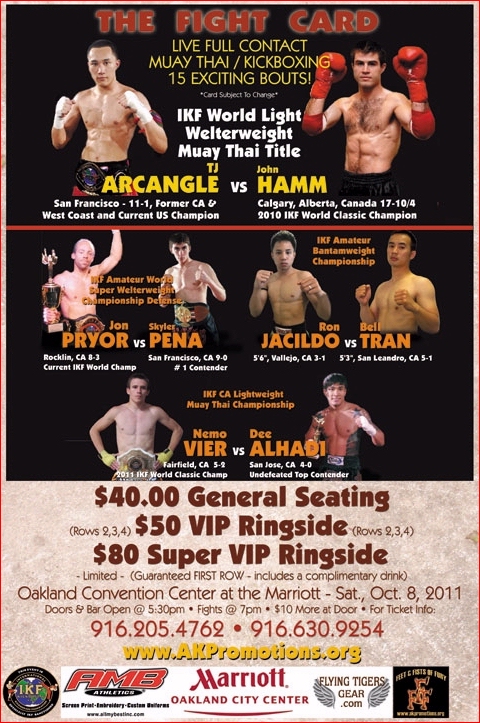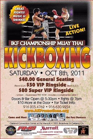 AK Promotions is one of the leading promotions companies in California for the sport of Kickboxing. Based out of Rocklin, California the AK Promotions - www.AKPromotions.org team will be hosting an exciting evening of IKF Muay Thai Kickboxing Championship fights in the Bay Area! On Saturday, October 8th, 2011 at the The Oakland Convention Center adjacent to the Marriott Hotel, the room will be transformed into a magnificent fight arena that will showcase some of the best Muay Thai Kickboxers in the country!