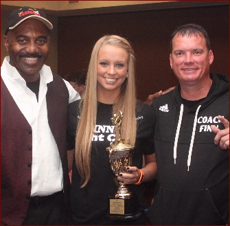 1. CHAMPION Andrea Leese (Liberty, Kentucky, USA) was awarded the trophy by Promoter Johnny Davis after her opponent withdrew from the tournament during the weigh-ins due to an injury the day before the tournament.