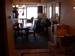Well everyone, sorry we didn't report in yesterday, there was a little thing called sleep we had to catch up on before presenting this opening story from IKF Homebase here at the Radisson Hotel in Davenport Iowa for this weekends 2002 IKF USA National Amateur Kickboxing Championships. The trip took a bit longer than I wanted it to but after driving over 1,800 miles, here we are at the Radisson Hotel for this weekends 2002 USA Nationals. All that's missing is YOU, the fighters and your trainers, coaches, our event officials and fight fans. Bring It ON! The trip took about 30 hours which included 5 or 6 stops for gas, a few stops for snacks and event supplies I needed to pick up along the way and a stop in Omaha Nebraska to have lunch with our good friend Brooks Mason. I try to live by that saying "Don't ask of others what your not willing to do for yourself," which as some of you know, gets me in trouble sometimes when I don't delegate enough responsibilities to others willing to do so (Last years Nationals for example...) so as promised, I drove the marathon trip here once again knowing that maybe someday, someone else will be willing to do it instead so I can sit comfortably on a plane like the rest of our IKF Staff. While the others are due to arrive Thursday and Friday, Johnny Davis arrived late last night by plane. Johnny of course was refreshed and ready to roll while I needed a little rest after unloading and carrying the 20 plus boxes to our IKF Radisson Office (Right & Below) filled with Championship Belts, IKF Souvenirs, T-Shirts, Gloves, Shin Pads, Computer Equipment and other event supplies. About 10 trips to the room later, our IKF Radisson Office quickly filled up.