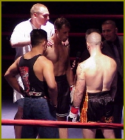 It was what everyone wants in a Main Event and what Everyone wants in a Title bout, especially a WORLD TITLE BOUT! IKF Pro San Shou Intercontinental Champion Rudi Ott of San Jose, CA, USA was the number 1 contender for the vacant IKF Pro San Shou Rules Middleweight World Title. With only a month to go to this event, matchmakers were still having trouble finding a worthy opponent. Enter IKF Pro Full Contact Rules Middleweight World Champion Dave "Madman" Marinoble. Marinoble saw an opportunity for another World Title to add to his FCR World Title and an addition to his other 6 IKF Title belts (3 Amateur & 3 Pro) and formally requested to be selected as the challenger for the Title against Ott. A week later, after a lot of background checking of Marinobles Mixed Martial Arts and Sport JuJitsu experience the IKF Title Board finally approved Marinobles (Right with trainer Greg Kirkpatrick) challenge request. In the beginning the odds heavily favored Ott. with an overall "SAN SHOU" fighting record of 26 wins against only 3 loses with 8 wins coming by knockout many thought this was easily Ott's Title to win. Why? Although Marinoble entered the challenge with a perfect 16-0 record with 2 draws and 8 wins by TKO/KO, none of his wins were in bouts that had leg kicks let alone knees to the body and worse yet, the explosive THROWS of San Shou. However, what others didn't know was Marinobles experience in Mixed Martial Arts and Sport JuJitsu where he fought mostly as an amateur complying a 20 win record against 6 loses along with a 6-1 amateur boxing record. The question was, "Was Marinobles additional experience enough to overcome Ott's experience as a veteran San Shou Style fighter?" As fight time came closer and closer we had the pleasure of reviewing some video of Marinoble's past experience. By Friday morning, a day before the bout, we had the two fighters at even odds to win the title, that is, if we were ones to set odds. This surprised many, especially those in the San Shou world where some expected Ott to, quote - unquote, "Throw Marinoble around like a rag doll." These words were not from Ott's camp. Ott's camp, like Marinobles had great respect for their opponent. With this all being said, Saturday nights IKF Pro San Shou Rules Middleweight WORLD Title finally came. Here's a round by round rundown of the action.