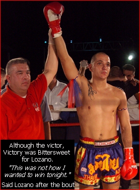 In round 2 Harminson came out quiet as did Lozano but it didn't take long before Harminson started to press the fight on Lozano. By the 1 minute mark Harminson was scoring easily. During the round Lozano went to kick and appeared to re-injure his right knee. An injury that almost forced him to pass up this title opportunity several weeks ago. The injury forced Lozano to seek security with the ropes in the corner of the ring as he leaned back on them. "When I tried to move on my leg it felt as if it would give away." Said Lozano after the bout. "My only chance was to stay in the corner and hope he (Jeremy) would come to me."