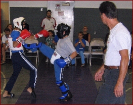 ROSEVILLE, CA, USA POINT KICKBOXING EVENT This semi contact event where full protective gear and 16 oz. gloves are mandatory for adults and face gear mandatory for the juniors always seems to garner great action packed fights and gets a great reaction from the audience! Says one competitor about the events, "Once you try it, it becomes addictive and the four foot trophies makes the addiction worthwhile!" Registration will start at 8:PM and elimination start at 10:AM. The all too important rules meeting for everyone will start at 9:30. Since there are no knockouts in IKF Point Kickboxing, newcomers are encouraged to be sure to make the rules meeting. There is little leniency on the rules and judges are not shy to disqualify for too much contact. Instructor Dale Sussdorf (Left) of Woodland, CA watches closely for points in a junior match. Teams will need to arrive early to assure their spot in the ring that morning. Things will move fast as preparation for the evening event will be in progress on another front. |