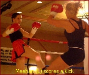 Meehan's opponent, Sher Noah claimed to be 16-0 as an amateur boxer and 1-3 as a pro boxer, but none of that experience did much to help her. In the second round, Sher turned her back to Meehan and when she turned back around, Meehan landed a great attack of punch and kicks to her stomach and at 1:10 of the round the bout was over. As in many previous Boxer vs Kickboxer match-ups, the outcome was the same, kickboxer win, Boxer lose as Sher just could not stand toe to toe with the experienced Meehan. The bout was fought under Pro International rules however Sher insisted upon wearing shinpads, a big NO in Pro Kickboxing. However somehow, those in charge allowed Sher to wear them. Needless to say, it didn't help her. Sher looked anything but an experienced boxer as Meehan took her apart with her hand combinations. Sher was able to land one good shot to Meehan's jaw but that was about it. Meehan won the 2001 IKF USA National Amateur Tournament IR Flyweight title when she defeated Tracy Kuschel of Omaha, Nebraska by unanimous decision, 29-28, 30-28 & 30-28. At the 2002 IKF National Amateur Tournament she successfully defended her 2001 IR Title by defeating Tamie Lankey of Alexandria, Virginia by unanimous decision 29-27, 29-27 & 30-26. In 2003 no women challenged Meehan for her National title so she switched rule styles and entered the Muay Thai Rules Bantamweight division. However she became the only walkover winner of the 2003 National Amateur Tournament when both her opponents, Alison Moore (2002 IR Champion) of New York, New York, USA and Alona Kipp of Casper, Wyoming, USA were both no shows at the event. Although not confirmed, it was possible Williams did not show because of the massive power outage in the north/east USA and parts of Canada that shut down many airports (Including New York) on Thursday before the event that year. We look forward to Princess Meehan's next big fight! |