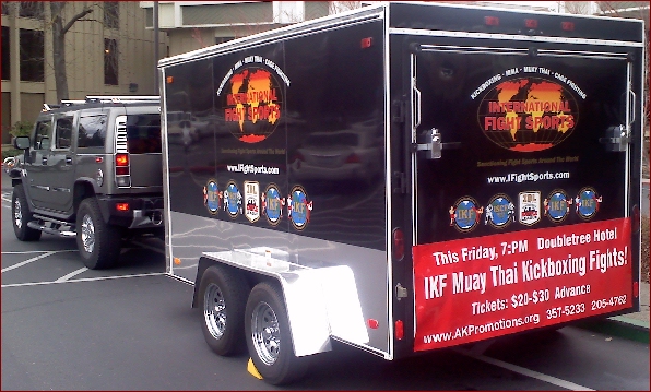 AK PRESS: The IKF Trailer is parked in front of the Doubletree Hotel, signaling the start of an exciting week that will end with a spectacular event this Friday Night at the Doubletree's Grand Ballroom in Sacramento, CA. Muay Thai Kickboxers from across the State will converge at the Doubletree to do serious battle for ring supremacy! The Hotel was packed this weekend with guests for conventions and other events and all of them stopped to take notice of the IKF Trailer colorfully plastered with logos made it clear...there was a fight about to happen! Many hotel guests did not hesitate to say..."We are excited to see the show...where do we get tickets?" exactly what any promoter wants to hear.